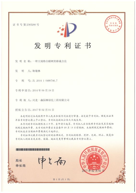 2017年2月1日,國家知識產(chǎn)權(quán)局頒發(fā)河北一森園林綠化工程股份有限公司“一種大規(guī)格白蠟樹的移栽方法”發(fā)明專利證書,專利號ZL201410480746.7,證書號2365266。本發(fā)明專利涉及樹木的移栽技術(shù)領(lǐng)域,移栽成活率高,投資少,簡單易行,效果好,效益高。在園林綠化工程中作用突出,好掌控效果顯著。河北一森園林已建成全國知名的大規(guī)格白蠟基地,在本發(fā)明專利方法的指導(dǎo)下,大規(guī)格白蠟的移栽成活率高達(dá)95%。